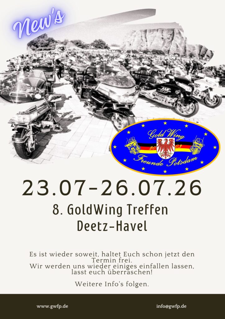 Nach langer Zeit mal wieder ein Lebenszeichen von uns. Wir trafen uns zum Stammtisch am 30.08.25 in Denny´s „Taverne“ in Deetz. Es war an der Zeit notwendige Entscheidungen zu treffen und wichtige Infos weiterzugeben. So galt es zunächst den Termin für das 8. Treffen der Gold Wing Freunde Potsdam e.V. bekanntzugeben/festzulegen. Ein großer Faktor spielt hier der Fussballclub FC Deetz, dessen Räumlichkeiten wir immer wieder zur Verfügung gestellt bekommen. Wir brauchen ergo ein spielfreies Wochenende.